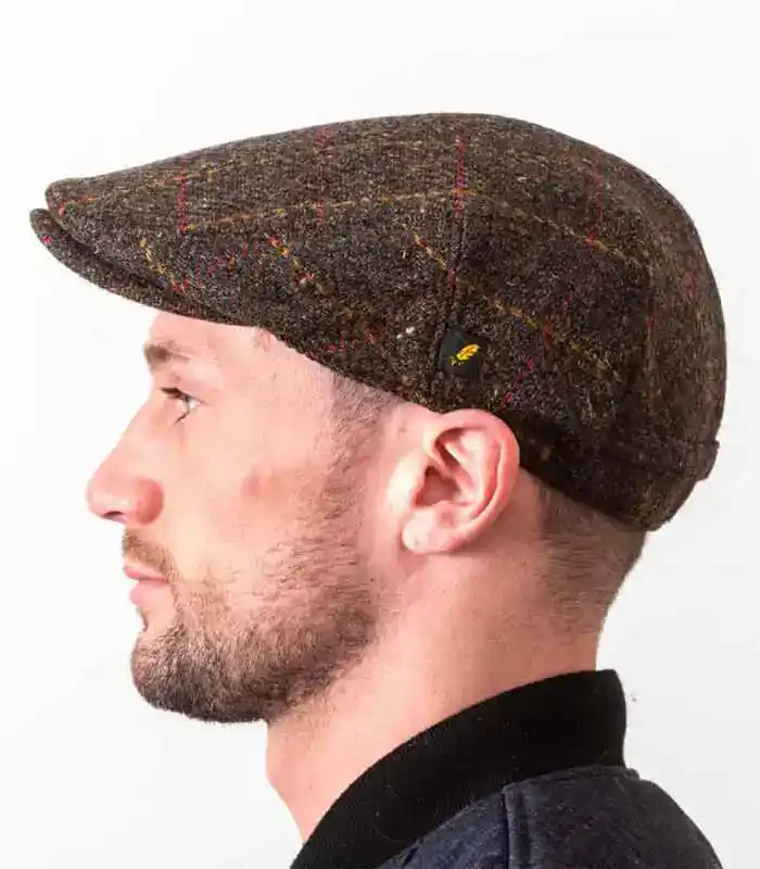Brown Overcheck Donegal Tweed Dubliner Cap with curved peak and quilted lining. Red & Gold lines. Classic Irish tweed cap with modern style. Ships worldwide.