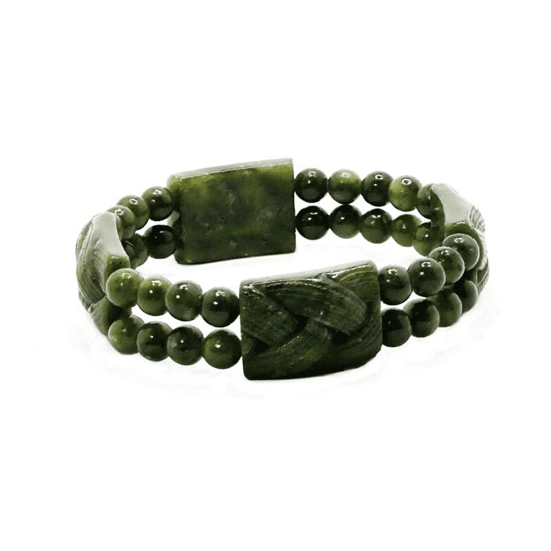 Connemara Marble double bracelet with Celtic knot panels. Irish symbol of strength & protection. Elasticated fit. Gift boxed & shipped worldwide.