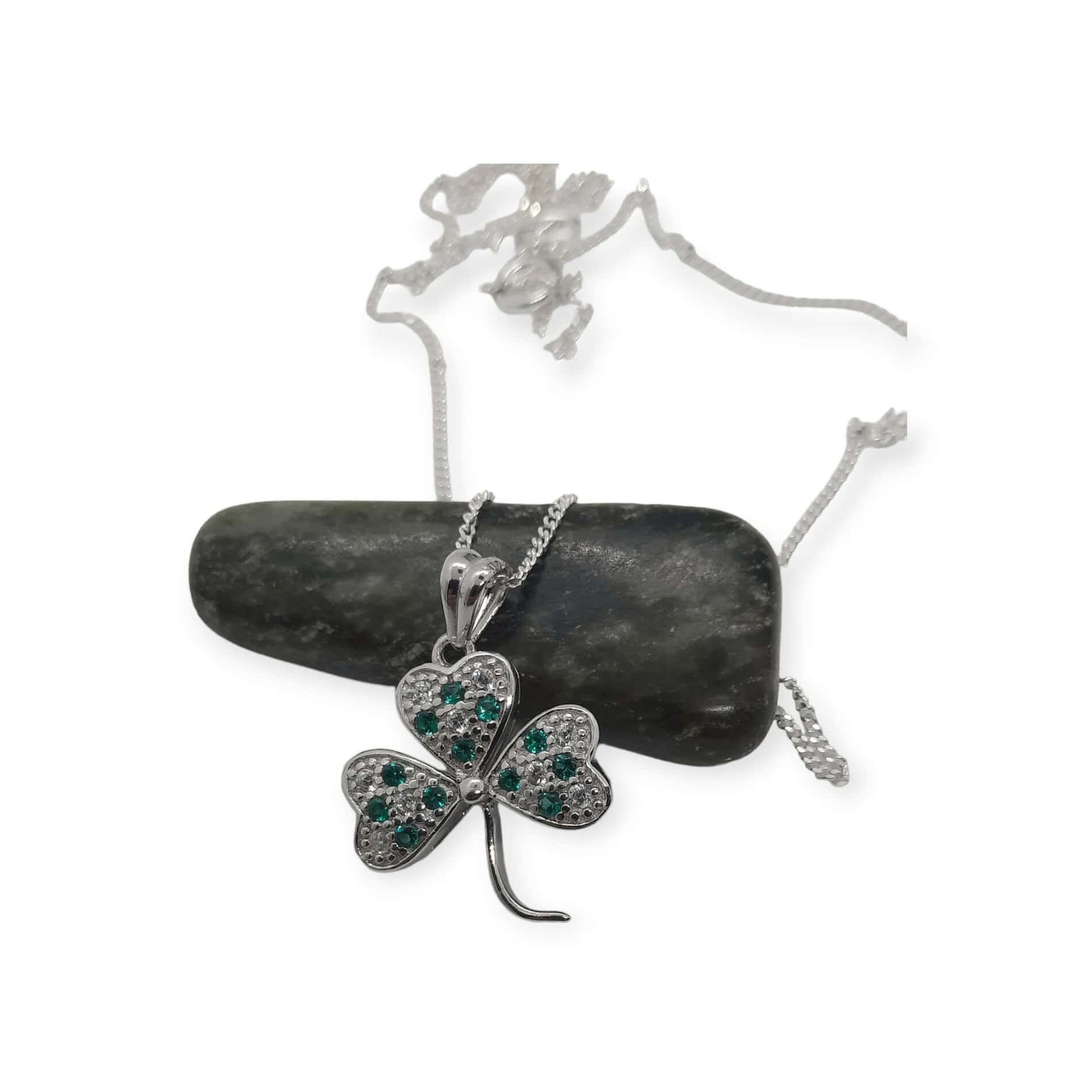 Shamrock Pendant Necklace made from Sterling Silver and Green CZ Stones – Irish Lucky Shamrock Charm Pendant – with Silver Chain and Gift Box – Shipping from Ireland – great value gift from Galway