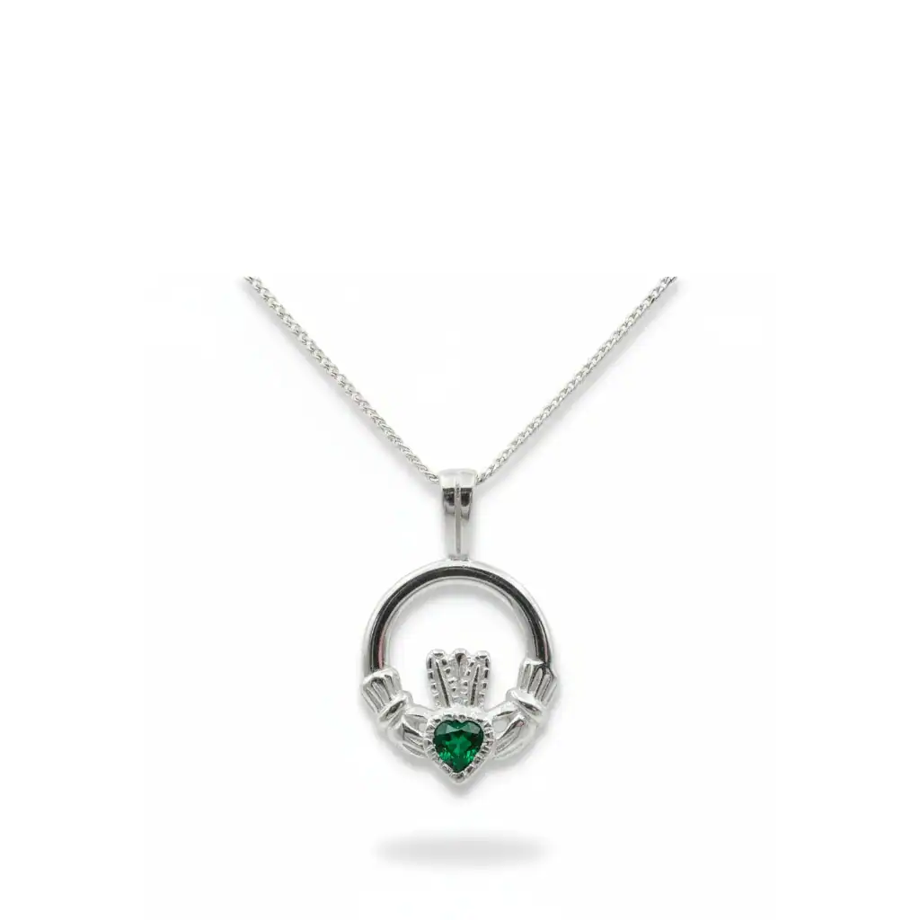 • Solid sterling silver Claddagh pendant with green CZ stone