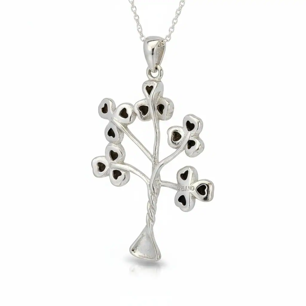 This striking Sterling Silver Shamrock Tree Pendant is one of our shop favourites — a distinctive design featuring five genuine Connemara Marble shamrocks arranged in the graceful shape of a tree. Crafted from solid 925 sterling silver, it celebrates Ireland’s natural beauty and enduring symbols of luck and protection.