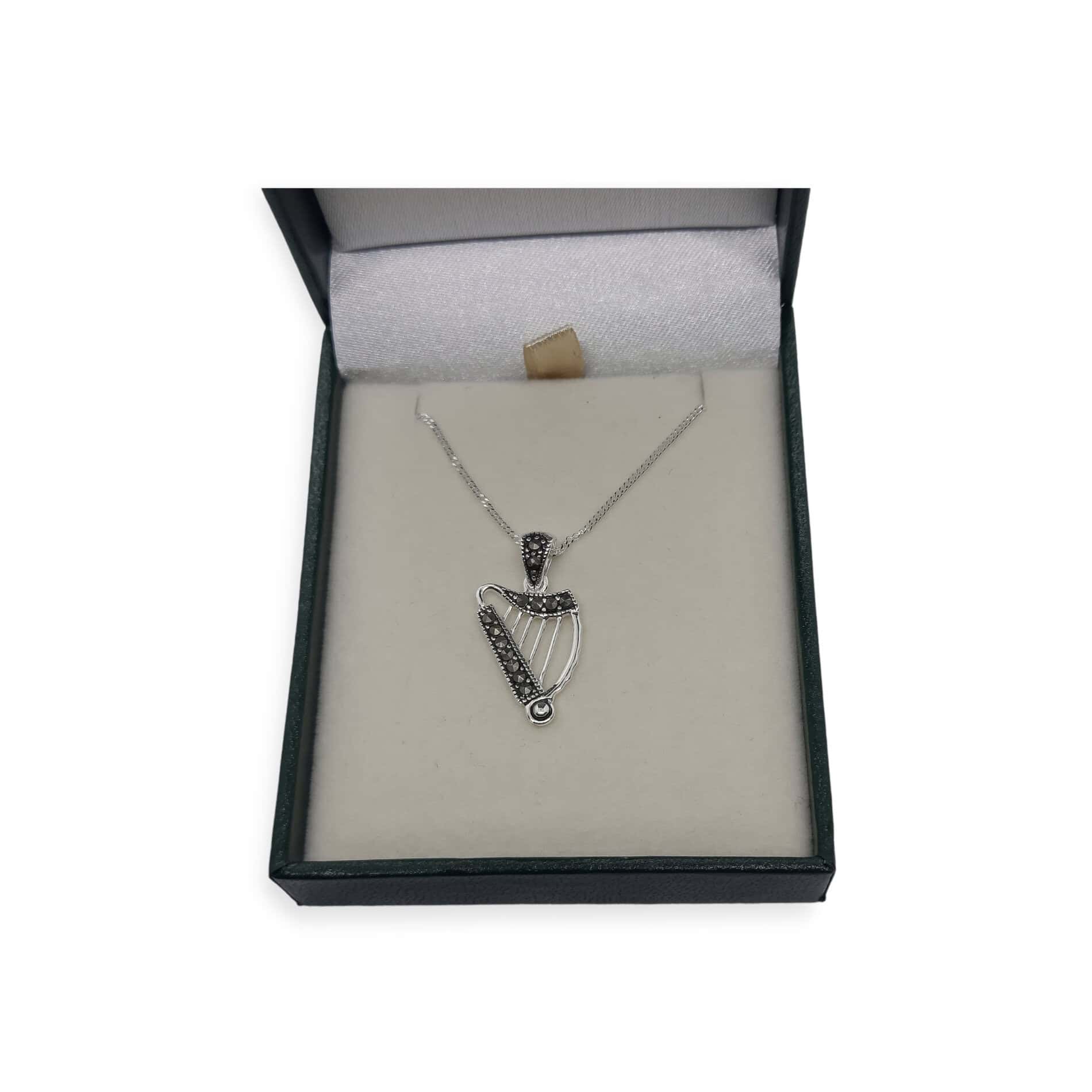 Silver Irish Harp Pendant with Marcasite – Irish Silver Harp Necklace with Marcasite finish – Ideal gift from Ireland – Official Symbol of Ireland Chained and Boxed – shipping worldwide.