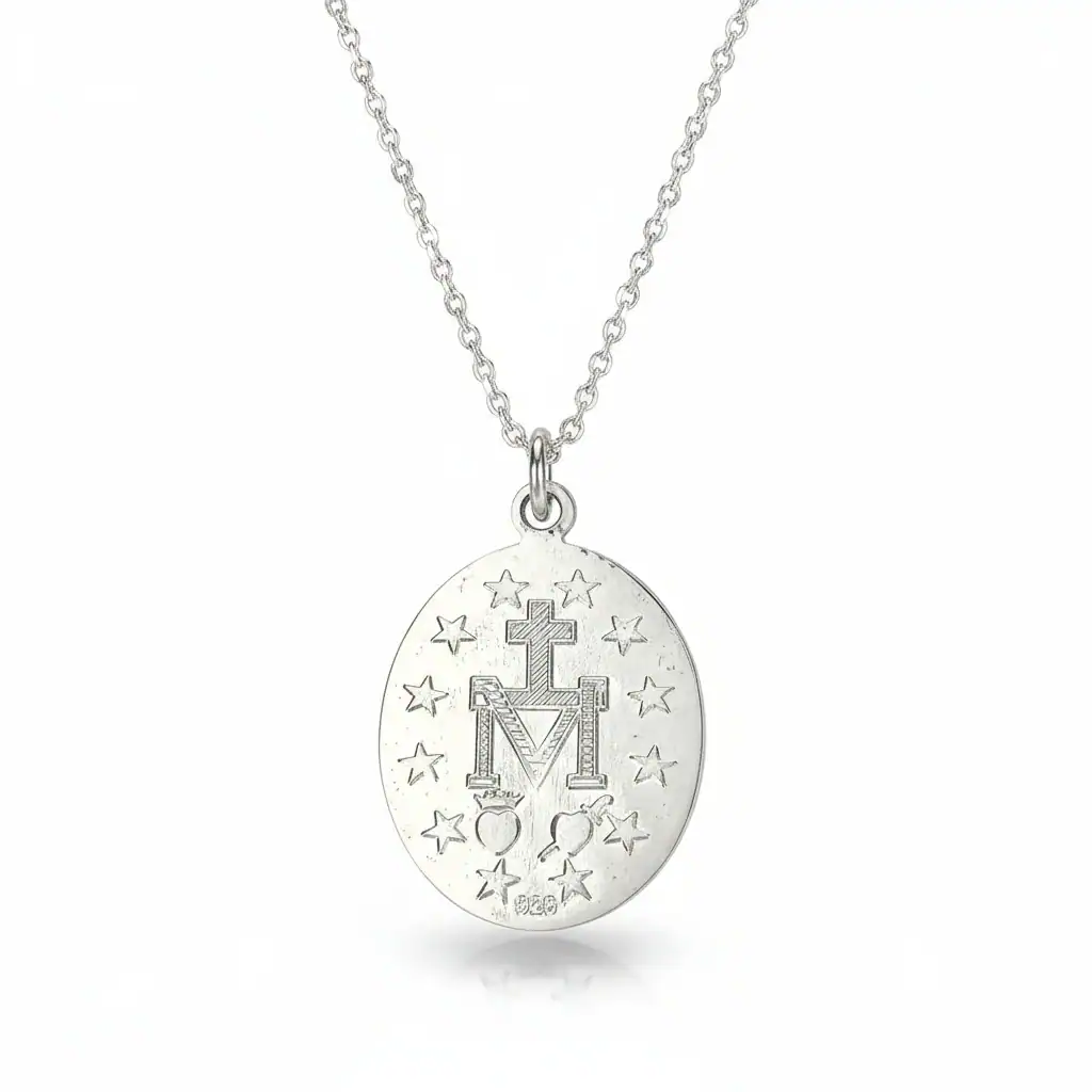 Sterling silver Miraculous Medal necklace featuring Our Lady & Marian symbols. A Catholic keepsake symbolising faith & protection. Gift boxed & shipped worldwide.