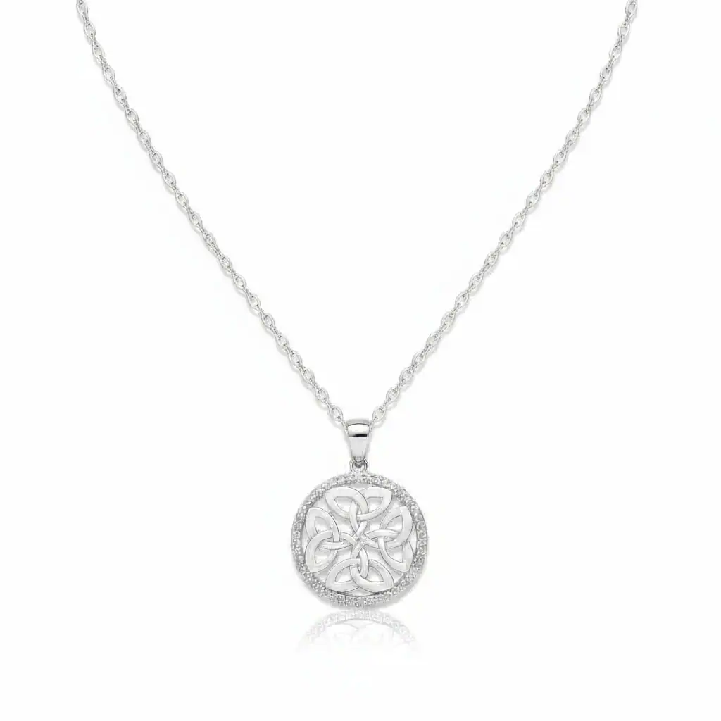 A Beautiful Harmony of Celtic Tradition and Craftsmanship – This Sterling Silver Round Pendant features an intricate Four Trinity Knot design, a graceful celebration of Ireland’s ancient Celtic heritage. Each Trinity Knot, or Triquetra, symbolises eternity, unity, and faith — and together, the four form a perfectly balanced circle, representing harmony and completeness.